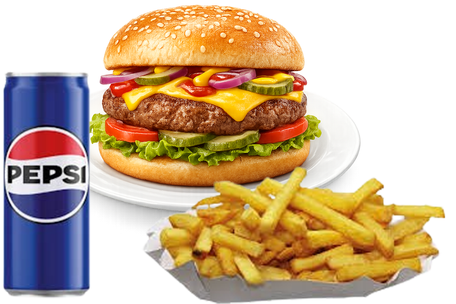 (Hamburger buci, házi készítésű húspogácsa, saláta, paradicsom, uborka, sajt, ketchup, mustár. választható krumpli, üdítő)