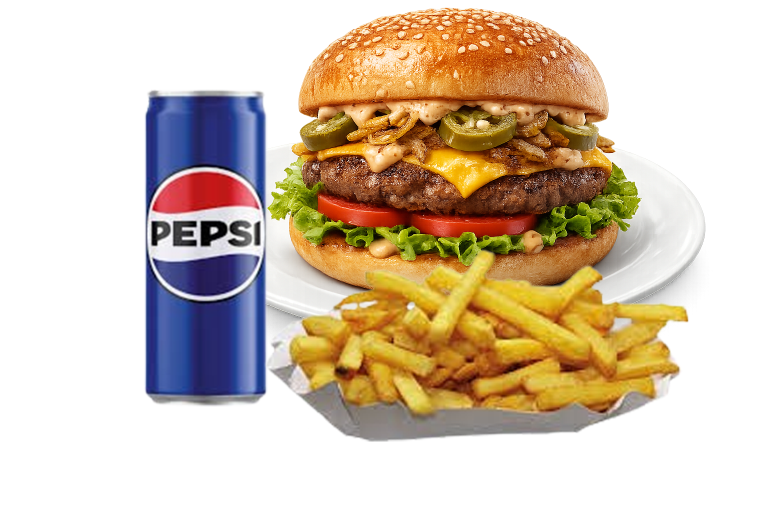 (Hamburger buci, házi készítésű húspogácsa, saláta, jalapeno paprika, paradicsom, pirított hagyma, cheddar sajt, hamburger szósz választható krumpli, üdítő)