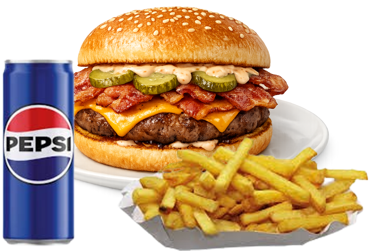 (hambi hús, cheddár sajt, bacon, csemege uborka, háziszósz, választható krumpli, üdítő)