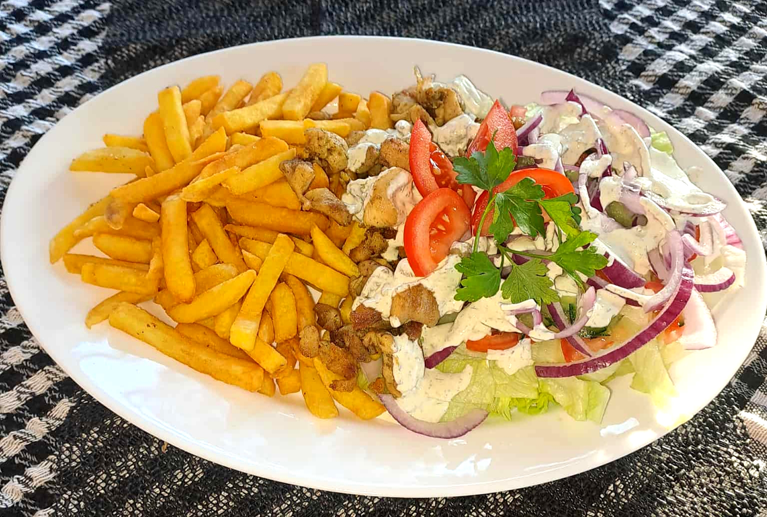 (gyros hús, zöldségek, hasábburgonya v. rizs, gyros öntet)