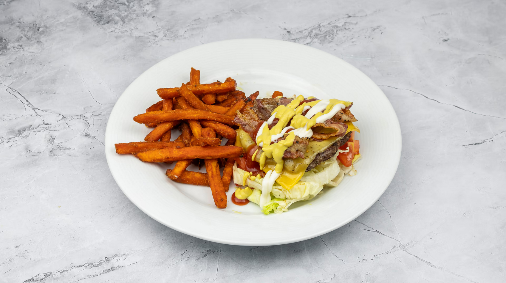 (sült édes burgonya hasáb, saláta, paradicsom, csemege uborka, 100 % marhahúspogácsa, ketchup, mustár, majonéz, cheddar sajt, ropogós bacon kockák)